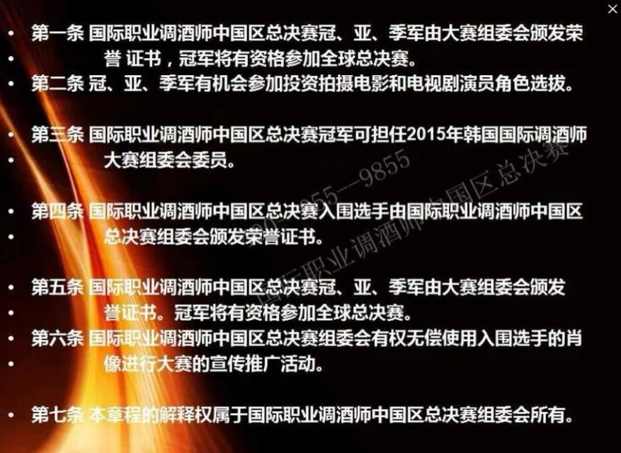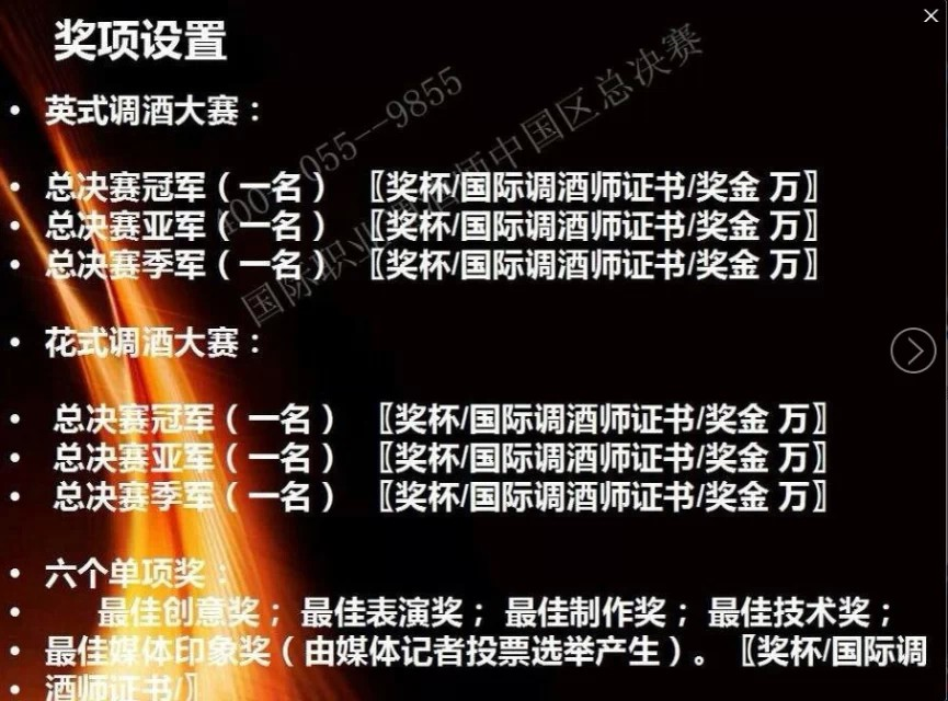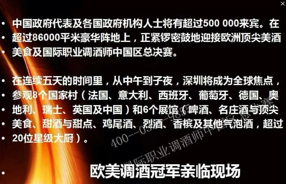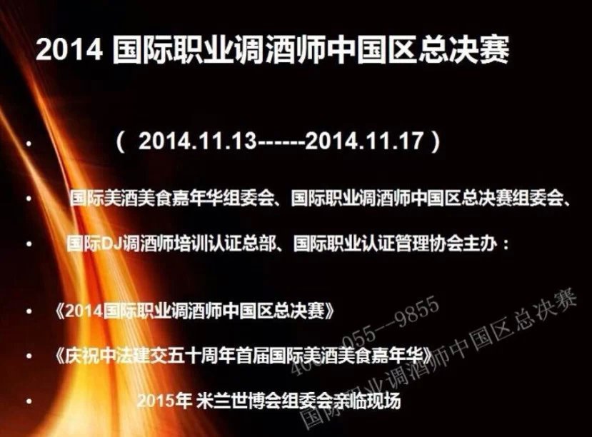 《2014國際職業調酒師中國區總決賽》《慶祝中法建交五十周年首屆國際美酒美食嘉年華》,2015年 米蘭世博會組委會親臨現場,歐美調酒冠軍親臨現場。國際美酒美食嘉年華組委會、國際職業調酒師中國區總決賽組委會、國際職業認證管理協會主辦!趕緊來報名吧!http://url.cn/QVcLxU