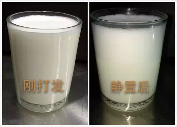 2、奶泡的細膩程度。(打發出的奶泡越細膩,則單個奶泡中所含空氣越少,密度高,浮力??;打發出的奶泡越粗糙,則單個奶泡中所含空氣越多,密度低,浮力大。如打發出的奶泡較為粗糙,奶泡會快速浮于牛奶表面,融合度較低;如打發出的奶泡較為細膩,奶泡浮于牛奶表面的速度會緩慢,融合度較高。)